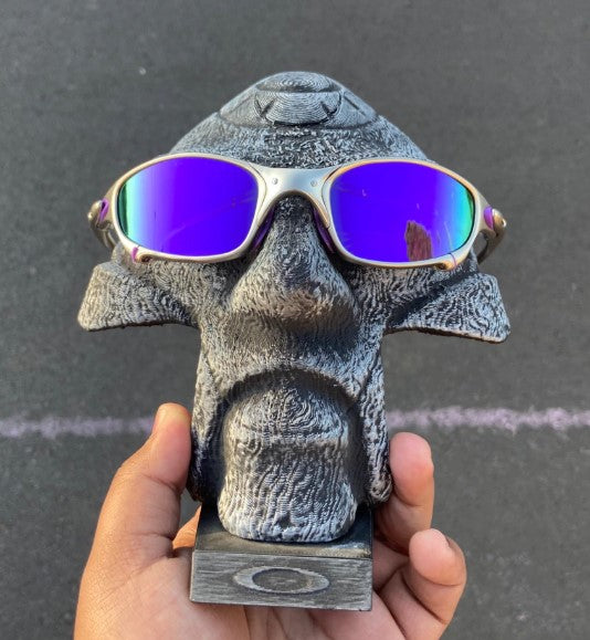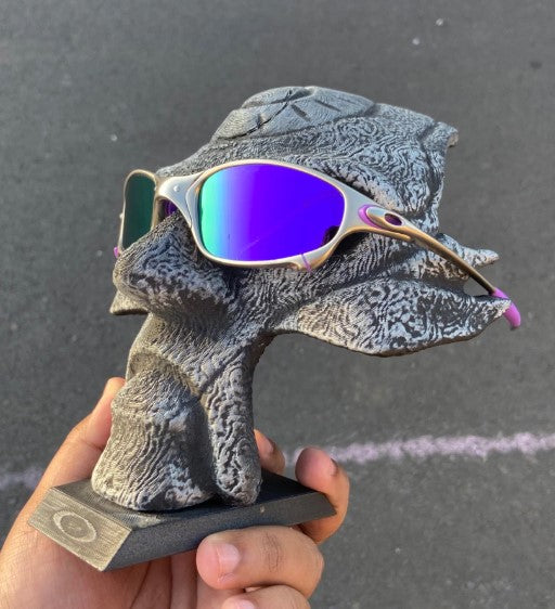 Juju Plasma Silver é puro impacto visual. Com armação em liga metálica na tonalidade prata e lentes espelhadas azul safira, ele carrega o DNA de um óculos de colecionador, com pegada esportiva e acabamento técnico.